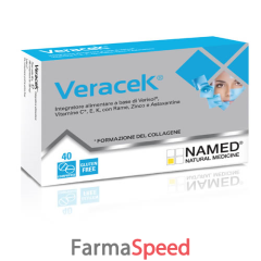 VERACEK® è un integratore alimentare a base di Collagene Idrolizzato Verisol®, Vitamina C, Vitamina E, Vitamina K1, Zinco e Rame. La Vitamina C contribuisce alla normale formazione del collagene per la normale funzione della pelle. La Vitamina E contribuisce alla protezione delle cellule dallo stress ossidativo. Il Rame contribuisce alla normale pigmentazione della pelle e lo Zinco contribuisce al mantenimento di una pelle normale.